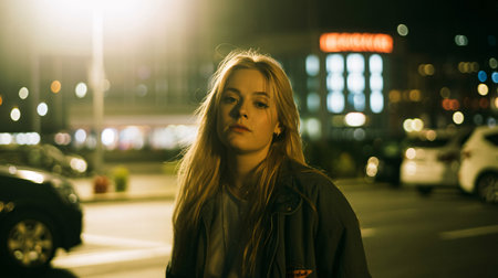 A young woman with long blonde hair stands contemplatively in a city lit by night lights.