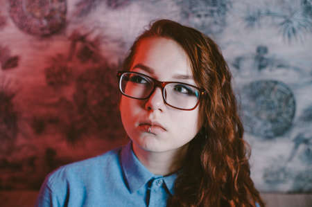 A girl with red hair is looking away. Photo in the room on a gray wall background. Hairstyle - curly hair on one side.