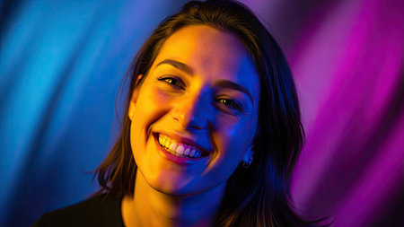 A woman smiles with a vibrant background of blue, yellow, and purple hues. The composition features a close-up portrait, likely captured in a studio setting. The colorful lighting highlights her features creating visual interest. Suitable for various projects including advertising or editorial usage.