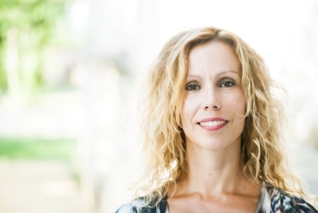 A woman with blonde hair smiles confidently while looking directly at the camera.