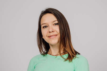 Beautiful young friendly and confident woman portrait. Studio shot, isolated on gray background