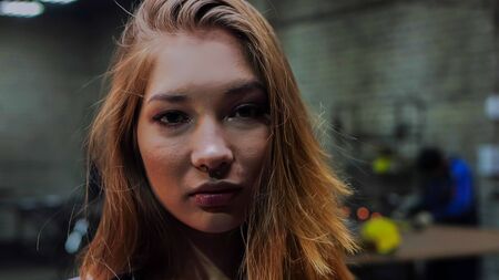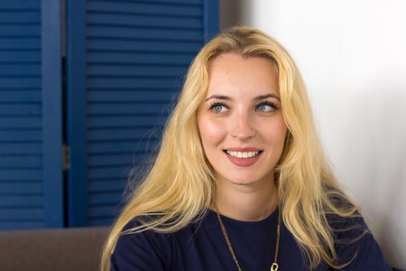 Girl with blond hair dressed in blue jacket looking into the camera. blurred background