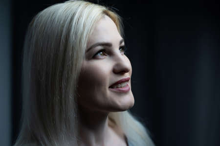 Closeup portrait of smiling middle aged white caucasian woman with waved curly red hair in black dress looking away dreaming on black background