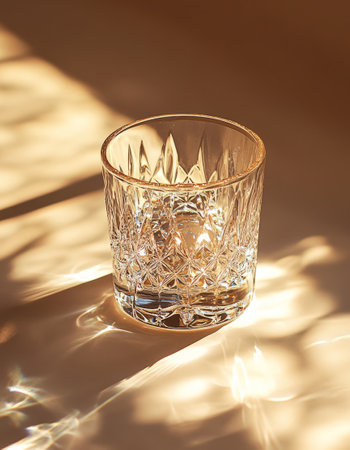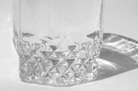 Empty textured crystal glass is standing on white table with beautiful sun reflections
