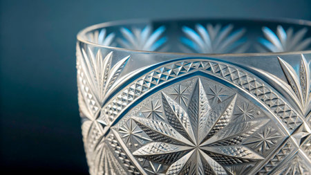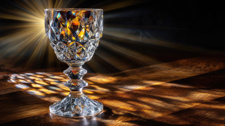 AI Generated. A closeup of a crystal wine glass catching the light with its multifaceted stem as well as delicate etched design