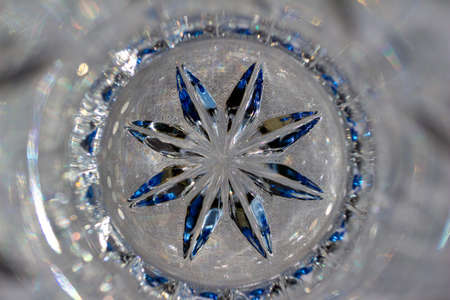 Lead diamond crystal in sunlight. Beautiful rippled glass. Glass vase illuminated with warm light. Octagram - eight-rayed star symbol macro photo.