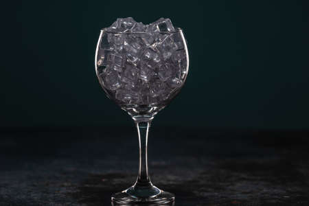 Empty crystal brandy glass on a dark black background in dramatic lighting. Isolated fine dining drinking glass bar & restaurant