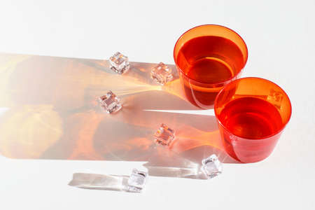 Red transparent glasses, ice pieces on the white background. Bright sunlights and hard long shadows.