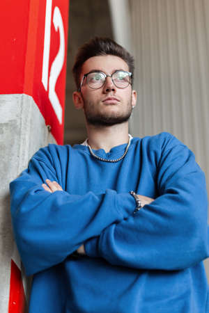 Handsome guy with fancy glasses in a stylish blue sweatshirt stands on the street hand in hand