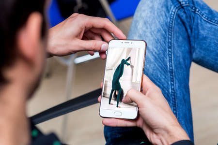 Male hands are making photofor a woman with hairstyle on smartphone. Hairstyle concept. Take photo on smartphone.