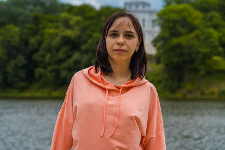 Female tourist standing and looking at camera on blurred background of pond and estate.