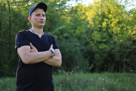 Portrait of a middle aged man in the summer at sunset on the shore of lake Baikal
