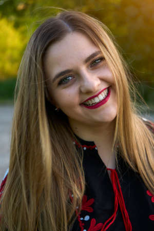Young smiling brunette girl with perfect teeth staring at camera, standing relaxed against green forest in casual clothes, lifestyle and emotions concept. Vertical photo.