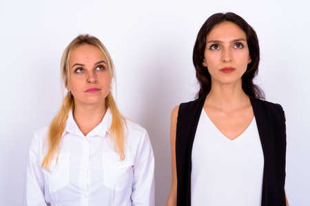 Take photo with mobile camera in two woman hands isolated on white studio background