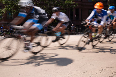 Breathtaking image of a group of cyclists touring the vibrant streets of a bustling american city