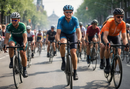 A diverse group of people ride their bikes in unison down a bustling city street, Cyclists racing in the Tour de France, AI Generated