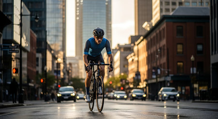 Athlete cycling through a vibrant city, wet road reflects golden hour light.