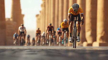 A group of cyclists speeds through majestic ancient pillars, radiating focus and athleticism. The background is partially obscured, highlighting energetic motion and a competitive spirit.