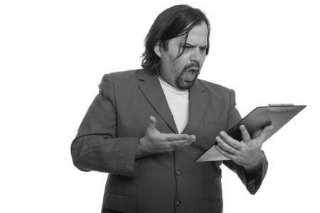 Fat Caucasian businessman looking angry while pointing and reading on clipboard