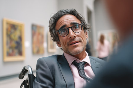 A stylish man in a wheelchair engages in conversation at an art gallery, highlighting accessibility and participation in the arts. He shows keen interest in paintings.
