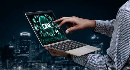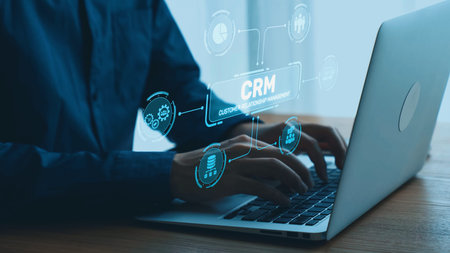 Business professional working on laptop with CRM graphics highlighting customer relationship management concepts. Asymptotic smart data analytic.