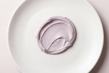 A smooth smear of pale lilac cosmetic clay mask rests on a round white plate highlighting the thick creamy texture and organic ingredients typically used for facial treatments and spa therapy.