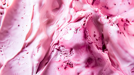 A close-up shot of pink frozen yogurt with smooth, creamy texture. Abstract background with swirls and peaks of the frozen ice cream surface. Generative AI