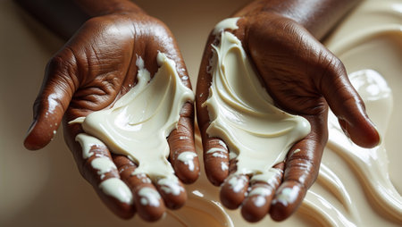 Close up of hands covered in moisturizing shea butter, emphasizing the natural skincare benefits of this rich ingredient. Ai generated image