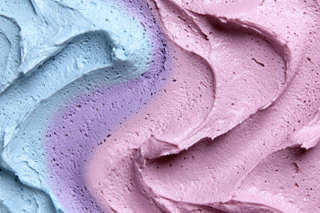 A pink and purple frosting swirl with a purple and pink hue. The frosting is thick and creamy, giving it a rich texture. The colors blend together seamlessly, creating a beautiful