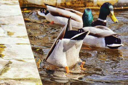 Three ducks catch food in the lake head in the water. Outside only the back of the ducks.