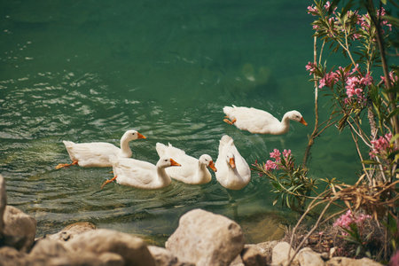 White Geese Swimming in a Serene Green Lake with Pink Flowers