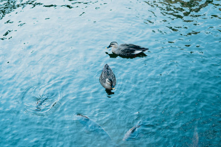 Ducks swimming calmly in a serene pond during a bright sunny day in a natural environment