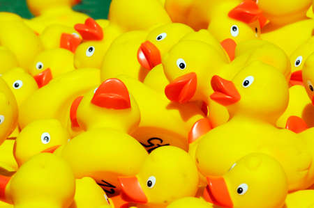 a bunch of yellow plastic ducks with red beaks, toy animals