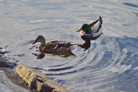 Two ducks, male and female, swimming on a blue lake in shallow water, top view