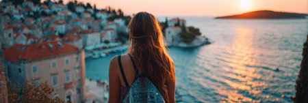 Woman gazes at a stunning coastal town during sunset, with warm colors illuminating the water and buildings while the sun slowly sinks on the horizon.