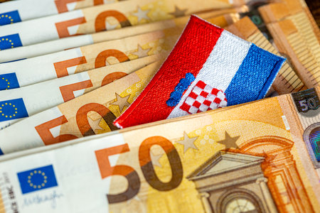 Croatia euro. Croatian flag peeking out from behind euro banknotes. Financial concept. Financial analysis of Croatia after joining the eurozone. Close-up