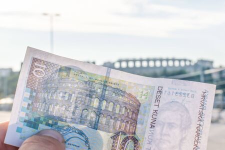 Papernote of Croatian ten KUna is holded in a hand in front of historical Pula arena in Craotia. Tourism and Croatian taxes in 2020.