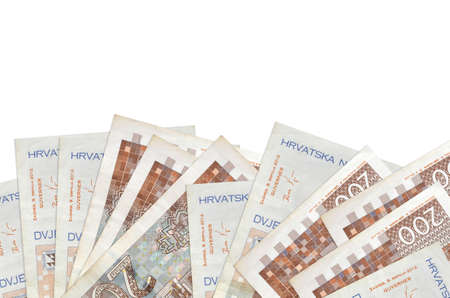 200 Croatian kuna bills lies on bottom side of screen isolated on white background with copy space. Background banner template for business concepts with money
