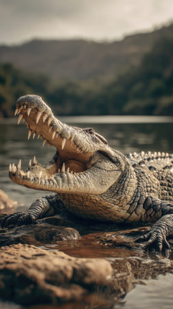An impressive crocodile is positioned with its mouth wide open, displaying sharp teeth. The reptile rests near a body of water, with a blurred backdrop of mountains and foliage. The image, employing natural lighting, captures the animal's textured skin, potentially suitable for nature-focused publications and design projects.