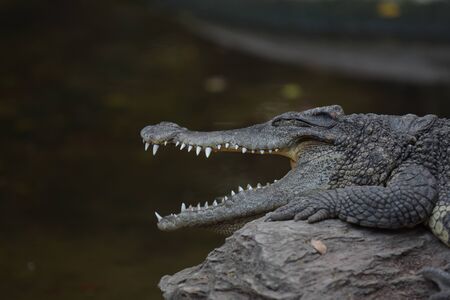 Aggressive crocodile. Alligators on the send bench