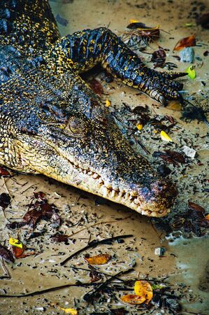 Saltwater crocodile (Crocodylus porosus) or Saltwater crocodile or Indo Australian crocodile or Man-eater crocodile. sunbathing at the swamp.