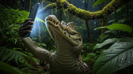 A crocodile takes a selfie in a lush green forest with a smartphone
