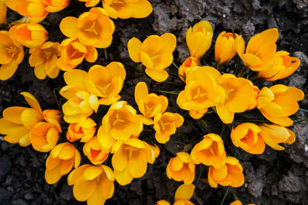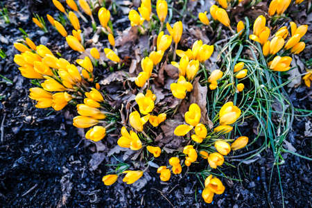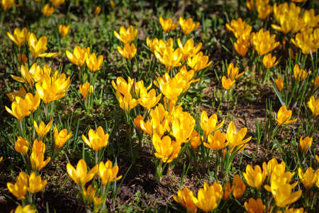 Yellow crocus flowers, Yellow Mammoth flowers in blossom in early spring.