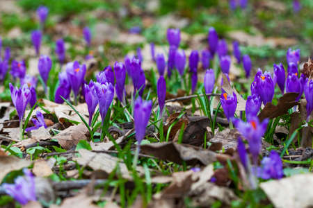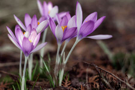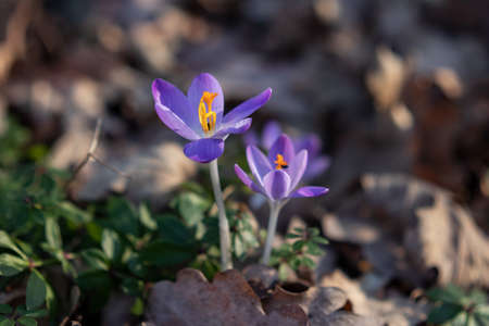 Beautiful crocus flowers in the forest. Early spring. Selective focus.