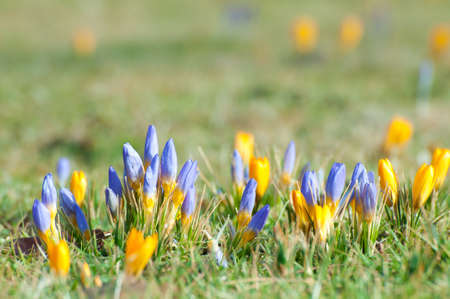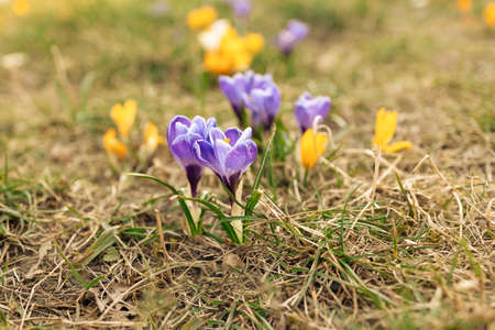 Beautiful blooming purple and yellow crocuses blooming on a spring field.