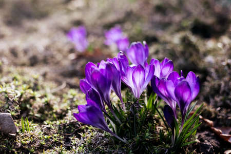 Purple crocus flowers in garden, awakening in spring to the warm gold rays of sunlight