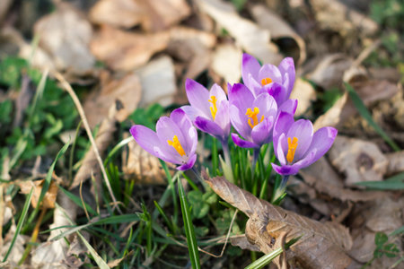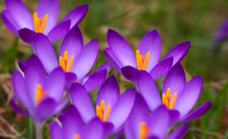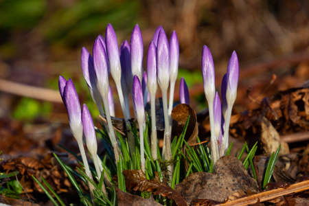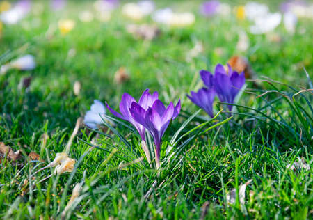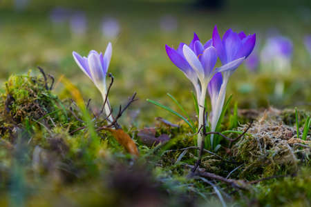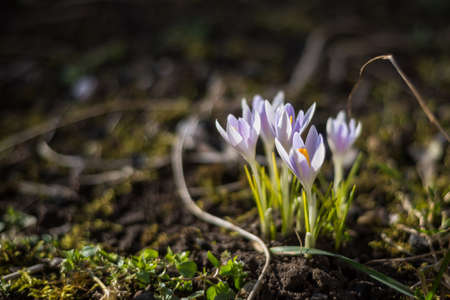 Beautiful spring background with close-up of a group of blooming purple crocus flowers on a meadow: Pretty group of purple and white crocus under the bright sun in spring time, Europe. Macro closeup photography