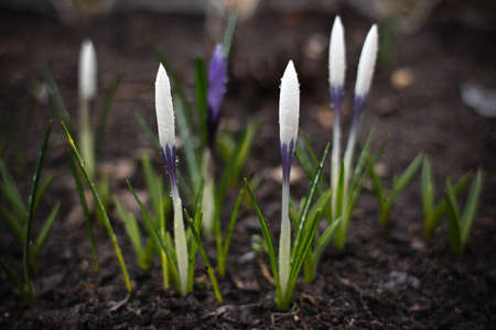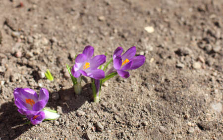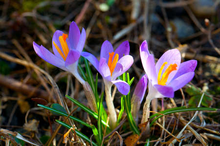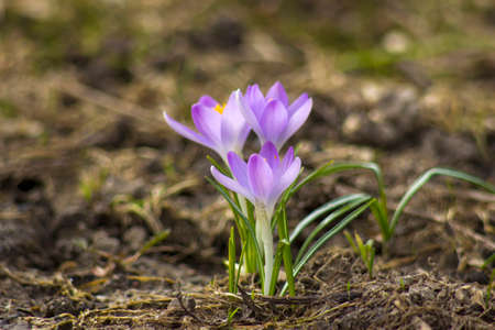 Spring crocuses - flowering violet flowers in the garden