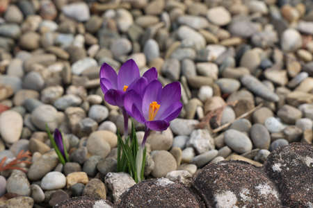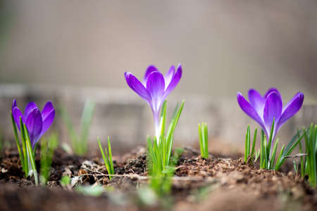 Beautiful purple crocuses blooming in the spring garden.