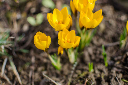 Yellow crocuses blooming in the garden background. Selective focus.